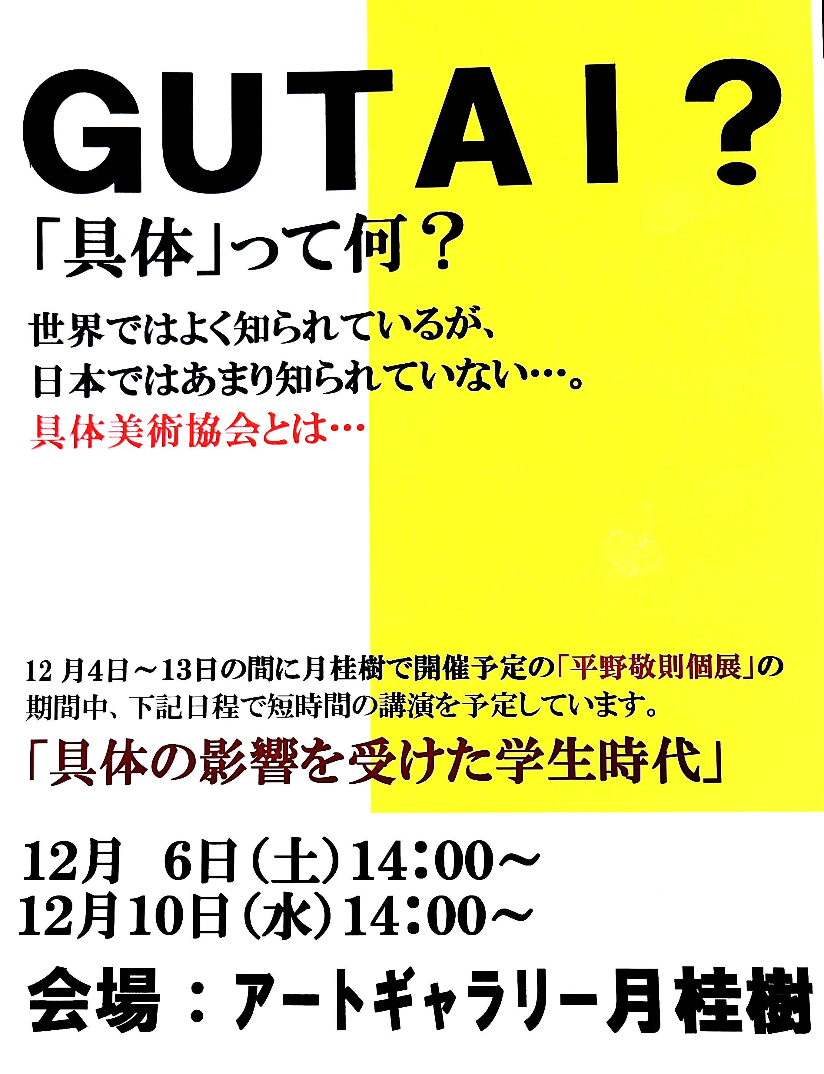 会期中には平野さん自身の体験を基にした「具体美術協会」についての公演も予定されています。関東近辺にお住まいの方は是非。